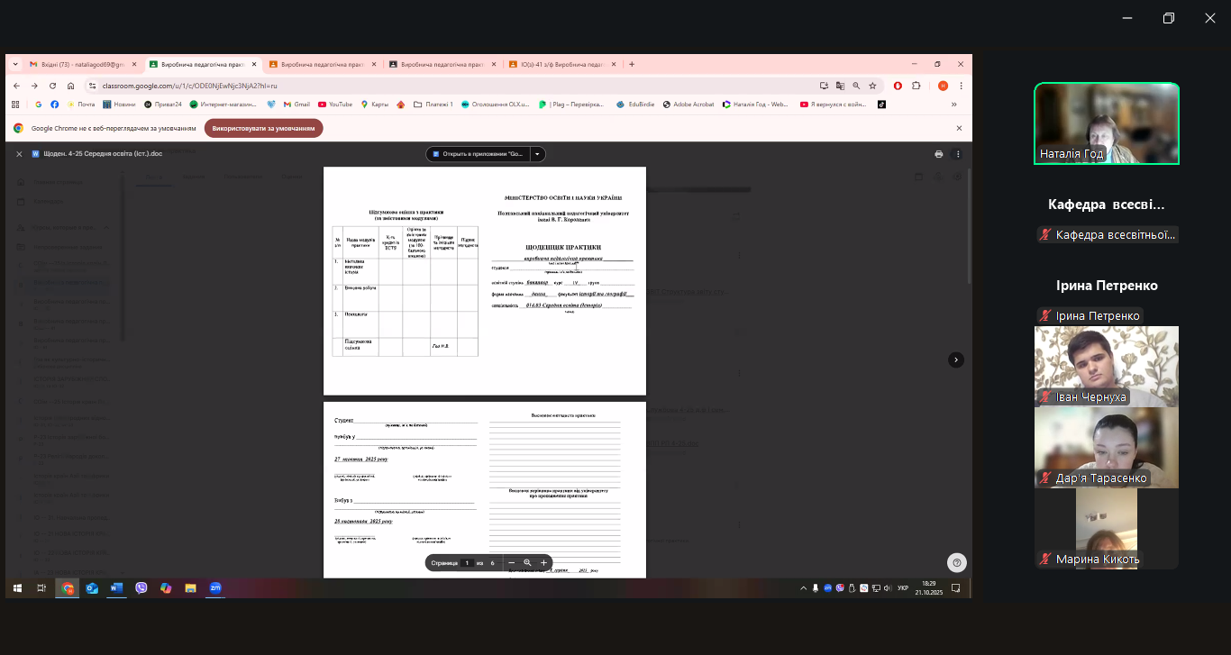 21 жовтня відбулася настановча конференція, під час якої заступниця декана факультету історії та географії з організації практик Наталія Володимирівна Год детально ознайомила студентів із вимогами до проходження практики, покроково пояснила порядок заповнення звітної документації, звернула увагу на типові помилки та поділилася практичними порадами.