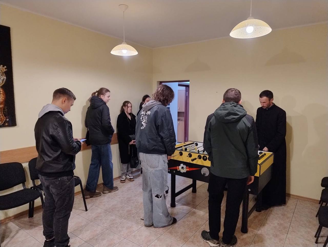 Цікавими та плідними на інформацію та роздуми були відвідини полтавської римо-католицької парафії Воздвиження Хреста Господнього. Настоятель церкви о. Олександр Пухальський провів змістовну бесіду, розповів як католицька Церква пояснює єдність Бога в Трійці, відмінність між гріхом і спокусою, трактує таїнство Євхаристії, які етичні виклики стоять сьогодні перед християнами. Студентів цікавило, як отець Олександр підтримує своє духовне життя, які книги читає, яку парафіяльну роботу вважає найважливішою, як балансує між служінням іншим та власним часом. На завершення, пропагуючи здоровий спосіб життя, о. Олександр запропонував зіграти в настільний футбол! Студенти із задоволенням відгукнулися, що стало чудовим і неформальним завершенням зустрічі.