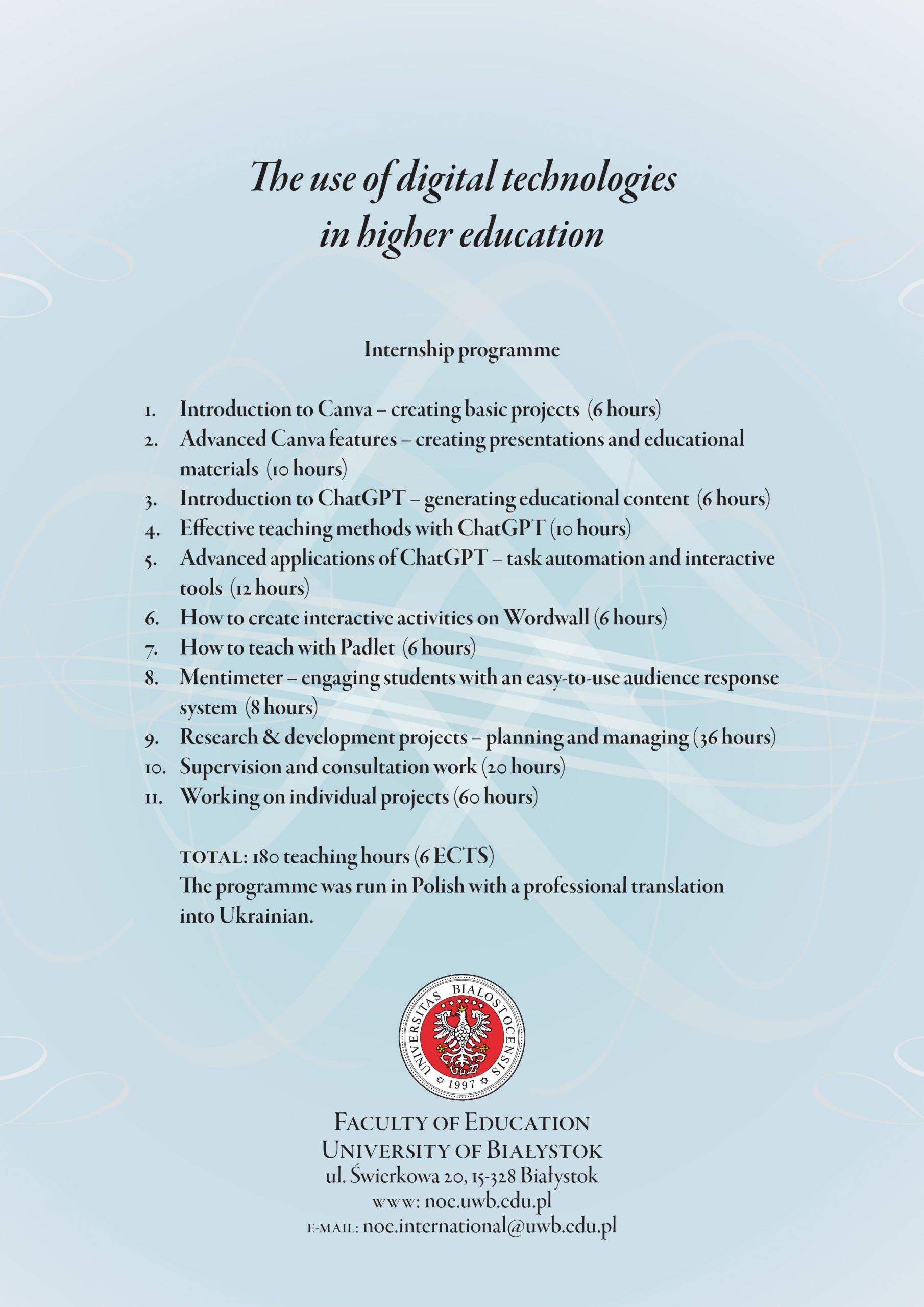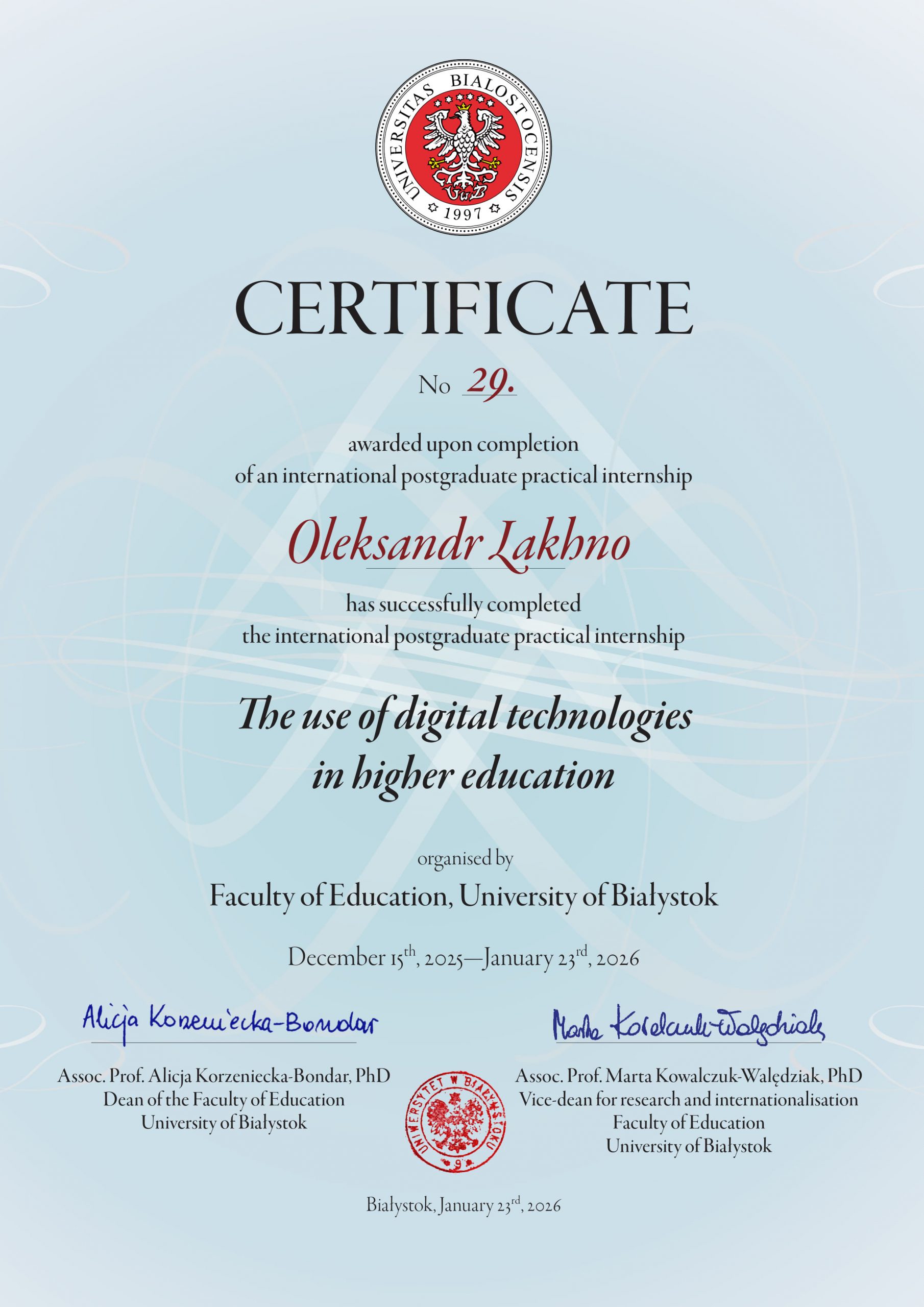 З 15 грудня 2025 року по 23 січня 2026 року відбулося міжнародне післядипломне практичне стажування «The use of digital technologies in highereducation», організоване Факультетом освіти Університету в Білостоці(Польща).