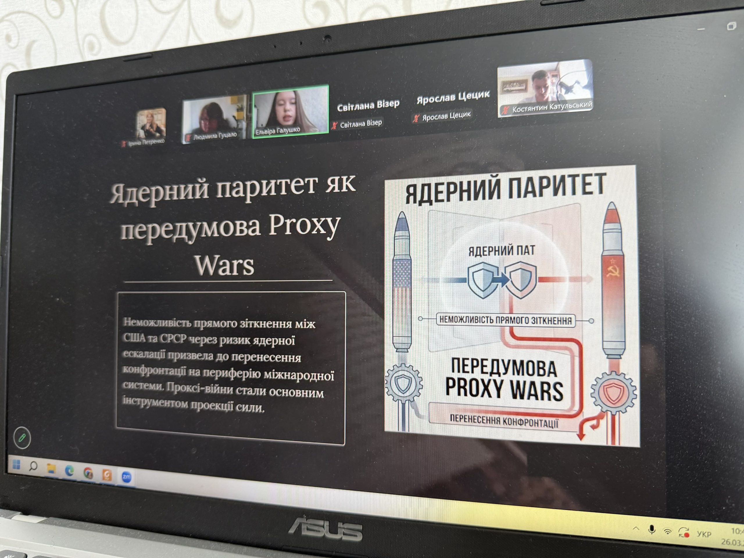 Здобувачка І курсу другого (магістерського) рівня вищої освіти Ельвіра Галушко мала честь відкрити пленарне засідання, де представила доповідь «Біполярна модель міжнародної системи як фактор інституціоналізації регіональних конфліктів». Ця тема досліджує, як протистояння двох наддержав (США та СРСР) під час Холодної війни перетворювало локальні суперечки на тривалі, структуровані конфлікти. Ельвіра Галушко у своєму виступі наголосила, що біполярна система зробила регіональні конфлікти частиною світового порядку, перетворивши їх із випадкових сутичок на постійний інструмент великої політики. Доповідь магістрантки викликала жваві дискусії, багато запитань і обговорення.