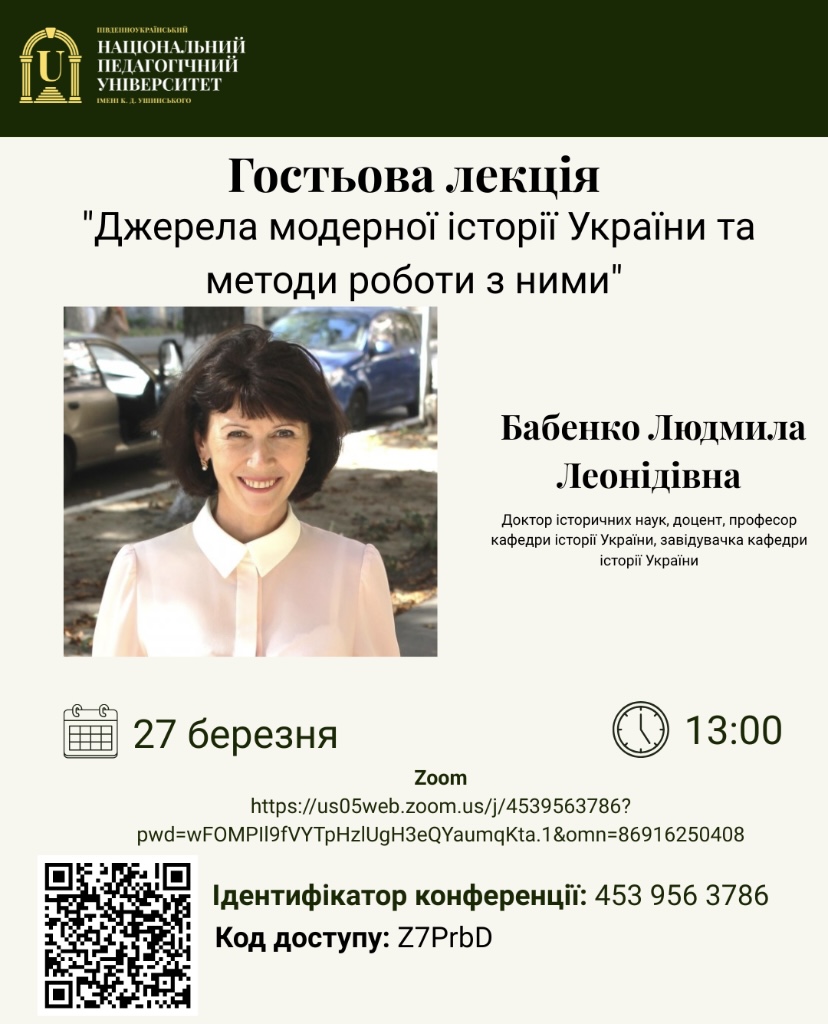 Так на запрошення кафедри історії України Південноукраїнського національного педагогічного університету імені К. Д. Ушинського (м. Одеса) для здобувачів третього освітньо-наукового рівня вищої освіти (доктор філософії) зі спеціальності В9 /032 Історія та археологія провела гостьову лекцію професорка Людмила Бабенко.
